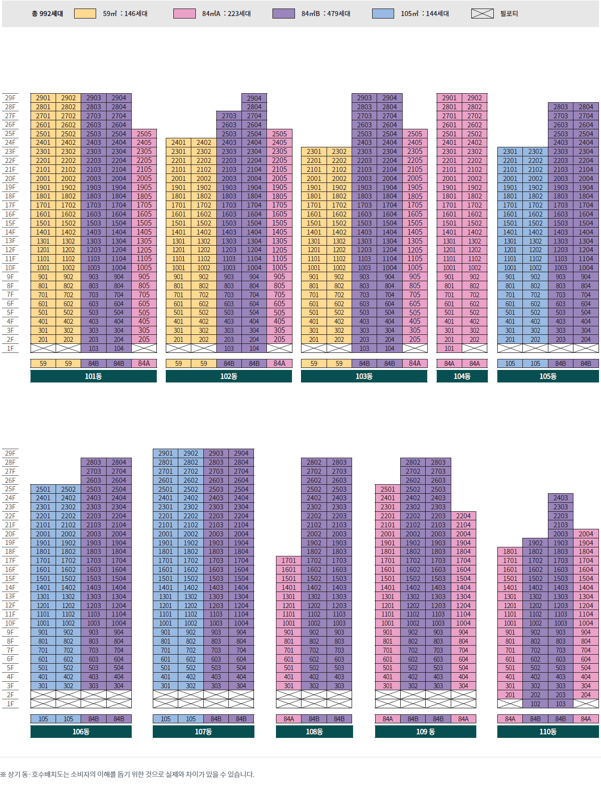 대상지는 광양시 용강리 산1-1번지 일원으로, 건폐율을 낮추고 동 간 이격을 넉넉히 확보한 점이 인상적입니다. 총 9개 동, 지하 주차를 기본으로 한 992세대 규모의 브랜드 대단지로 계획되어 스케일에서 오는 안정감이 확실합니다. 남향·정남향 위주의 배치와 최장 약 88m까지 벌린 동 간 거리 덕분에 사생활 보호와 통경축이 동시에 확보되도록 설계했습니다. 이 기본기만으로도 광양 푸르지오 센터파크가 가진 체감 쾌적성은 분명합니다.