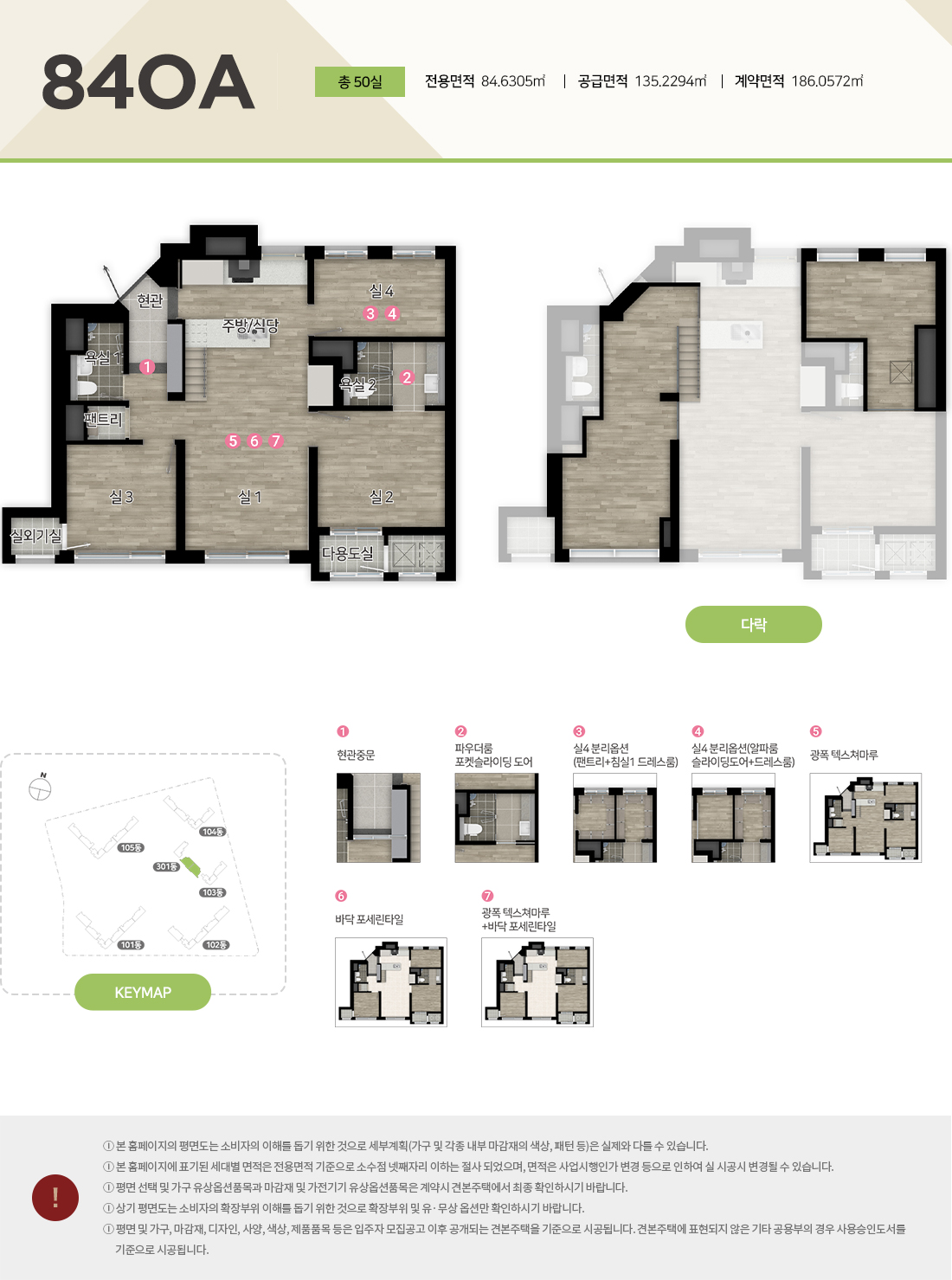 주력형 84A는 4베이 판상형과 맞통풍 동선이 장점입니다. 거실-주방 일직선 동선으로 생활 효율을 높이고, 알파룸·팬트리·현관창고·드레스룸을 곳곳에 배치해 수납 스트레스를 줄였습니다. 84B는 타워형 배치로 실·공간 분리가 확실해 사생활 보호에 유리합니다. 102㎡는 가족 수가 많은 집에 맞춘 대형 수납과 여유 있는 침실 폭이 강점입니다. 힐스테이트 서대구역 센트럴의 전 타입에 강화유리 난간, 와이드 창호를 적용해 개방감과 조망을 극대화한 점도 눈에 띕니다.