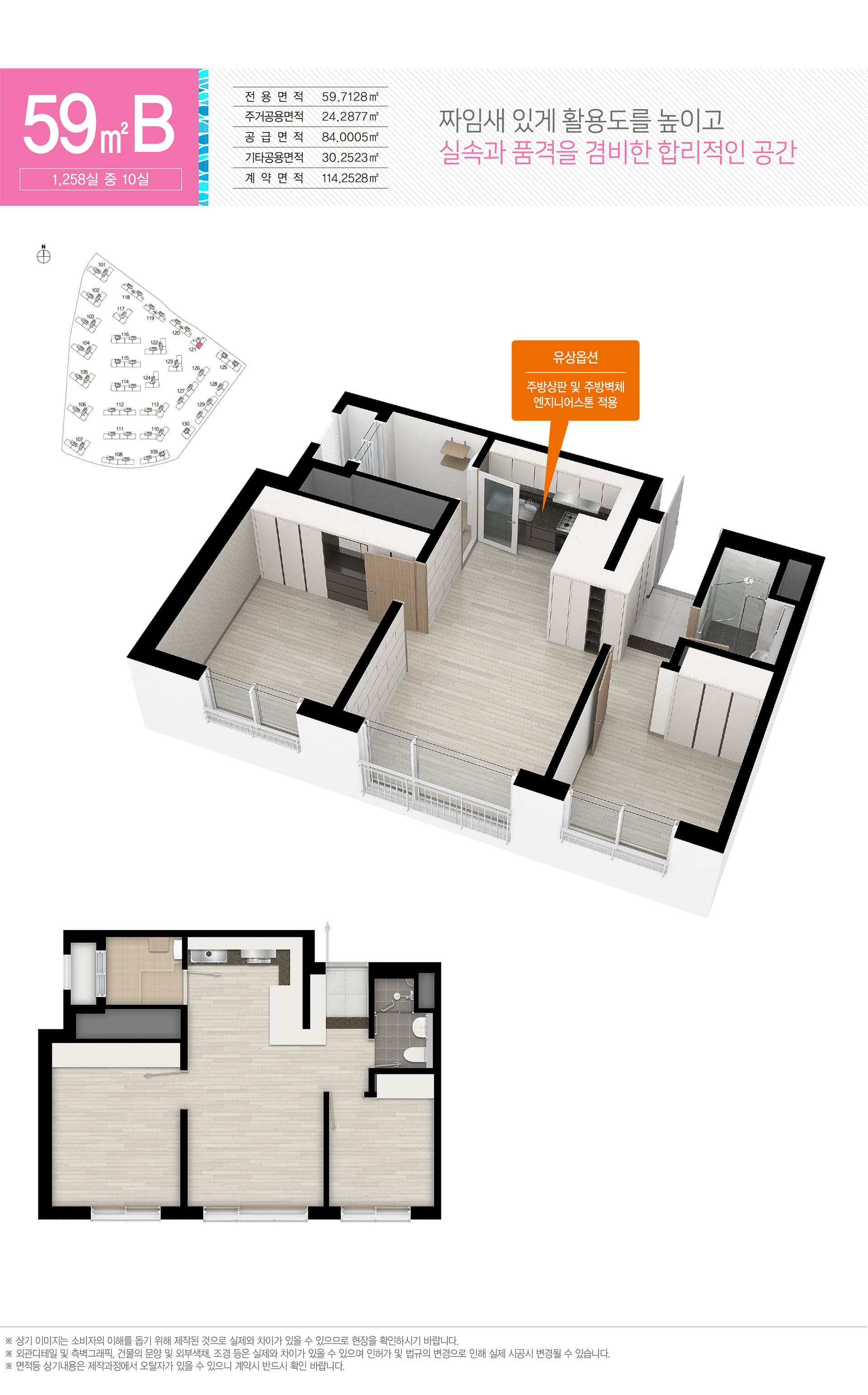 59㎡: 방2·욕실1 실속형. 첫 내 집·전입 가구에 적합하며, 관리비·유지비 부담이 낮습니다.