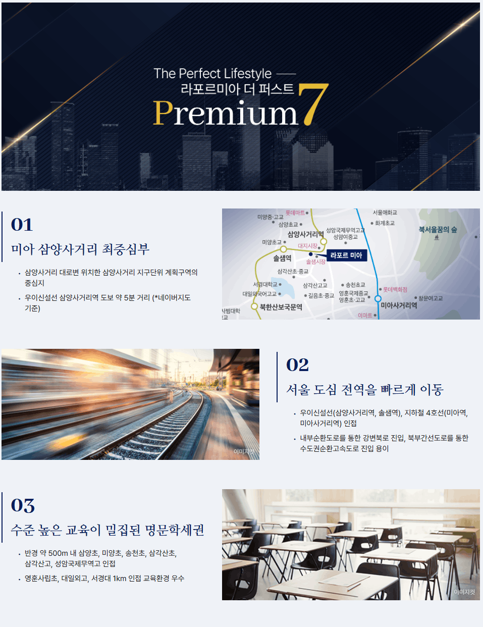 라포르 미아 더퍼스트는 대형마트가 가깝고 수유 상권 접근성이 좋아 일상 소비의 이동 비용을 줄이기 좋습니다. 초등학교가 인접해 통학 리스크가 낮고, 중고등학교와 대학권까지 주변에 분포해 교육 수요에도 대응합니다. 학원가 밀집 지역과의 연결성은 학부모 관점에서 중요한 체감 요인이 됩니다. 도로망은 내부순환도로와 북부간선도로 축을 활용하기 쉬워 광역 이동이 편하고, 우이신설선 등 대중교통 편의 개선 기대가 더해지면 생활 반경이 더 부드럽게 확장될 가능성이 있습니다. 뉴타운 권역 내 시장과 체육시설 접근성도 일상 만족도를 끌어올리는 요소로 작동합니다.