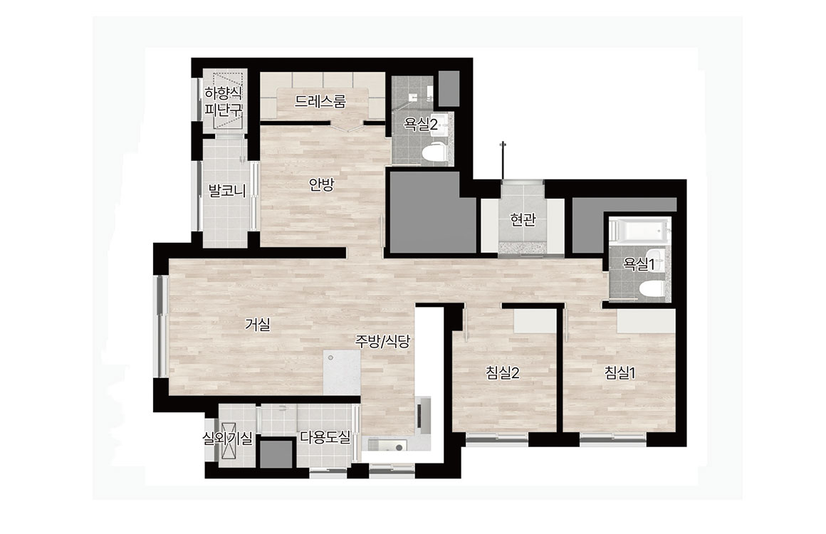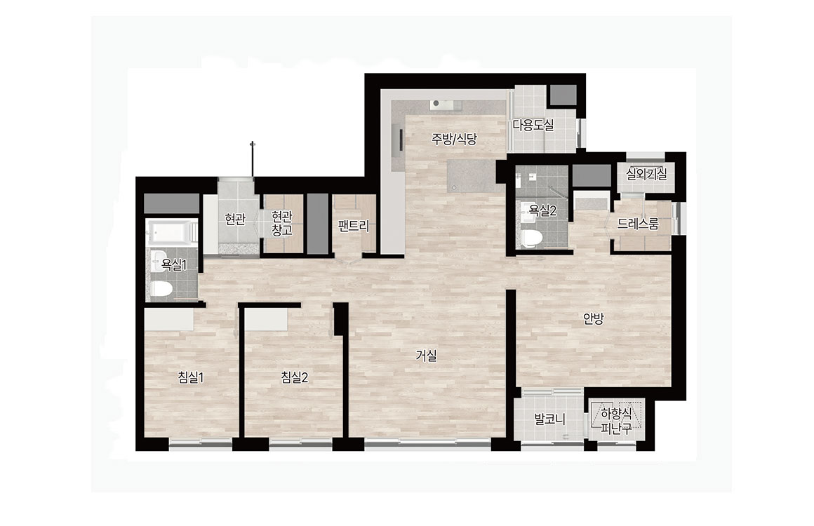 주력 면적은 59, 77, 84제곱미터로, 실수요가 두터운 중소형 구간을 집중 공략했습니다. 84형은 4베이 판상형 중심의 평면을 통해 거실 전면 폭과 채광을 확보했고, 대면형 주방과 다용도실 직결 가사 동선으로 체류 시간을 효율화했습니다. 현관 창고, 팬트리, 드레스룸을 적재적소에 배치해 수납 압력을 낮췄고, 일부 타입은 가변 벽체를 적용해 생애주기 변화에 따른 공간 전환이 수월합니다. 59형은 발코니 확장 시 체감 거실 폭이 커져 30평대 구축을 대체하려는 수요에도 대응합니다. 마감과 설비는 거실·주방의 개방감을 살리는 창호 비례, 건식과 습식의 명확한 욕실 분리, 무인 택배와 원패스 출입 등 생활 디테일에 힘을 준 구성이 눈에 띕니다.