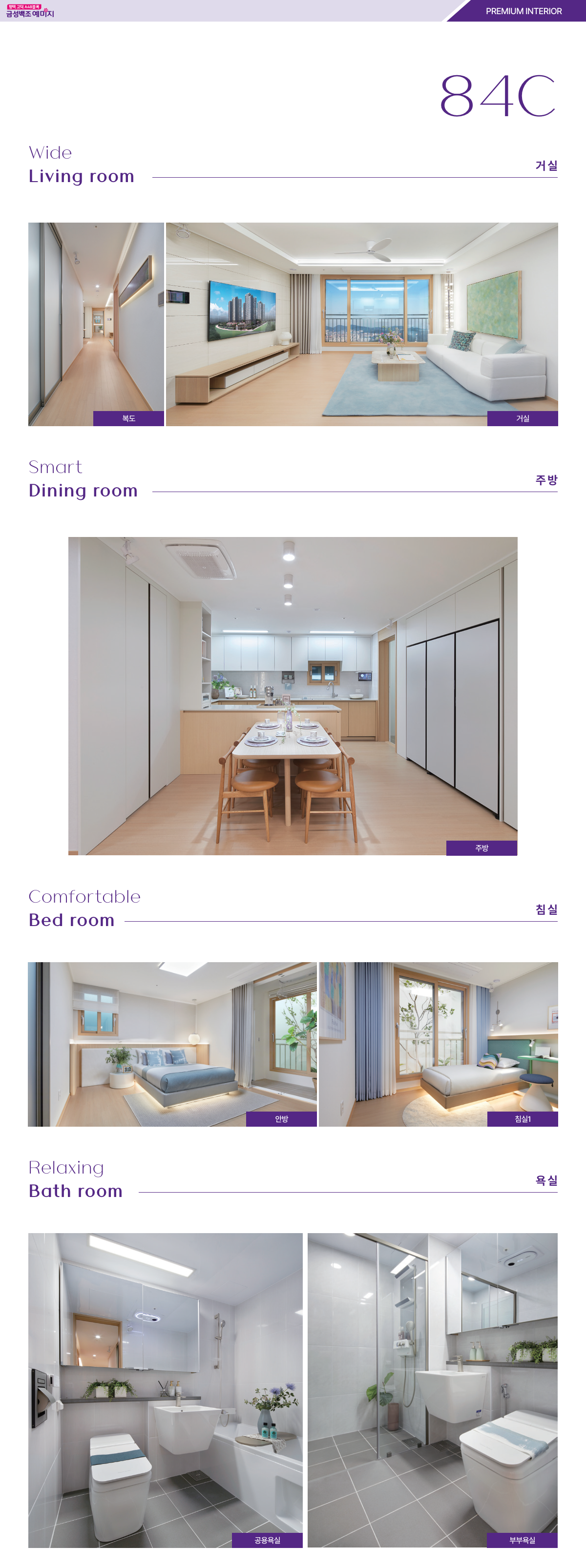 84A는 4베이 판상형에 맞통풍 구조, 거실·주방의 직관적인 동선이 강점입니다. 현관 창고와 주방 팬트리, 알파룸이 더해져 방 4개 활용이 가능하고, 드레스룸은 컴팩트하지만 수납 동선을 짜임새 있게 구성했습니다. 84B 역시 4베이에 알파룸을 포함한 방 4개 구성이 핵심입니다. 두 타입 모두 가족 구성 변화에 유연하며, 평택 고덕 금성백조 예미지는 같은 면적이라도 체감 공간을 넓히는 수납 특화가 돋보입니다.