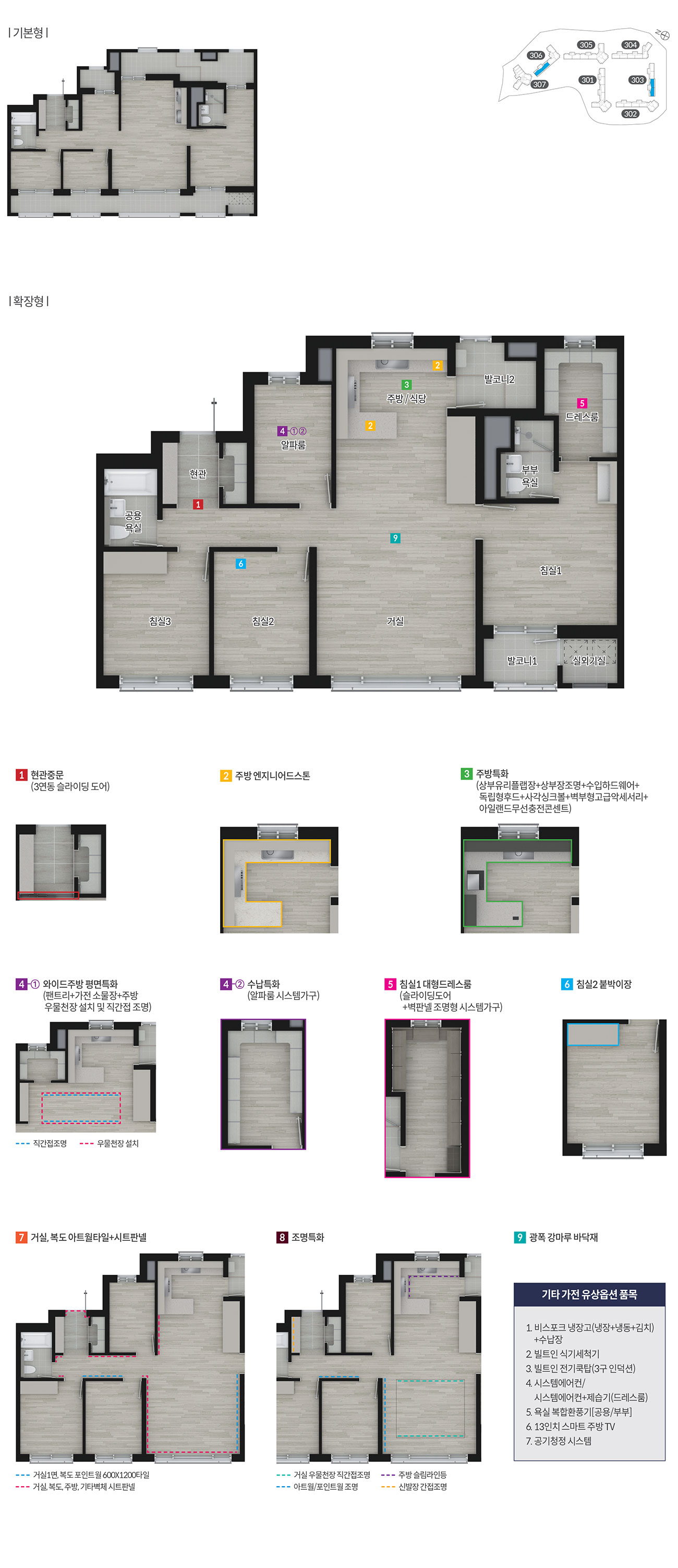 문산역 동문3차 디이스트는 전용 59에서 84 제곱미터까지 중소형 위주로 구성됩니다. 실수요층이 많은 59A는 침실 3, 욕실 2, 4베이 구조로 맞통풍과 채광이 뛰어나고, 알파 수납을 고려한 팬트리와 드레스룸이 강점입니다. 타입별로 제공되는 서비스 면적은 유연한 취미·수납 존을 만드는 데 유용합니다. 발코니 확장 시 일부 타입에서 드레스룸, 화장대, 주방 TV, 광파오븐 등 무상 품목을 제공해 초기 부담을 낮추는 전략도 눈에 띕니다. 84 타입은 거실 폭과 주방 동선을 넓혀 3~4인 가구의 생활 리듬을 정돈하기 좋습니다. 실사용성에 집중한 이 평면 전략은 문산역 동문3차 디이스트의 체감 만족도를 끌어올립니다.