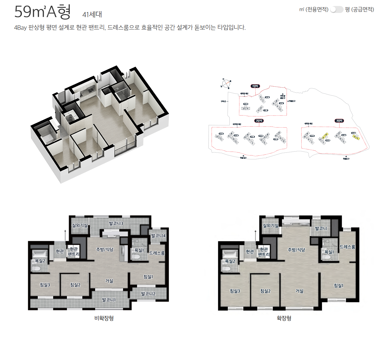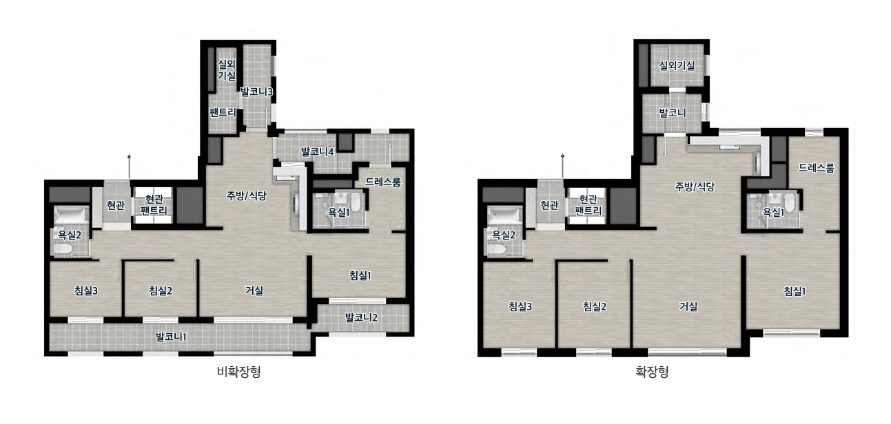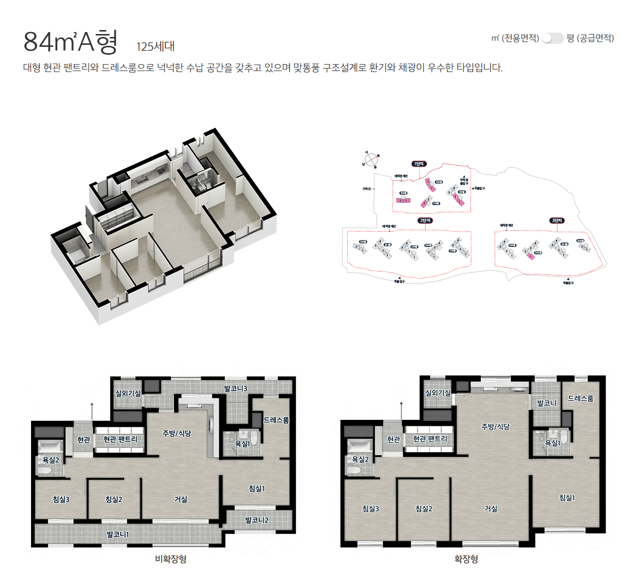 이편한세상 일산 메이포레는 전용 59㎡, 84㎡ 중심의 중소형 구성으로 실거주 선호와 환금성을 모두 고려했습니다. 두 평형 모두 4베이 판상형이 기본이며, 84㎡는 A·B 타입으로 선택 폭을 넓혔습니다. 84A는 거실과 주방이 맞통풍 동선으로 연결되어 환기 효율이 높고, 현관 팬트리와 안방 드레스룸을 배치해 수납 스트레스를 줄였습니다. 전열교환 환기, 실별 온도 조절, 홈 IoT 제어 등 기본 설비도 알뜰히 담겨 있습니다.