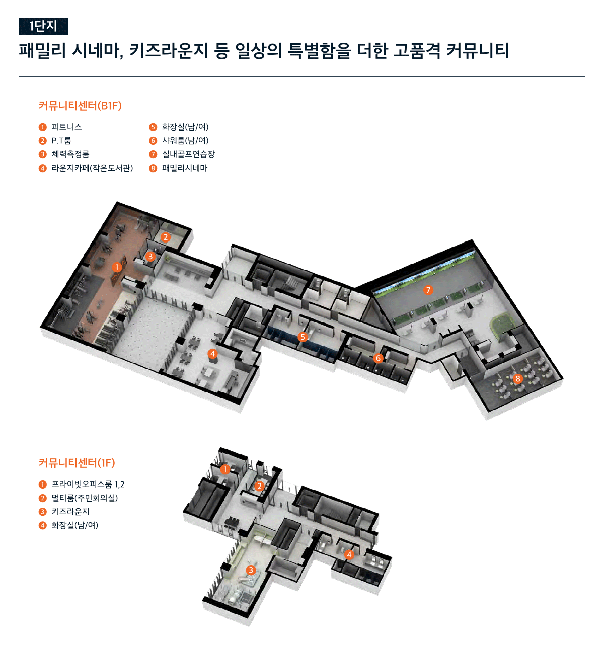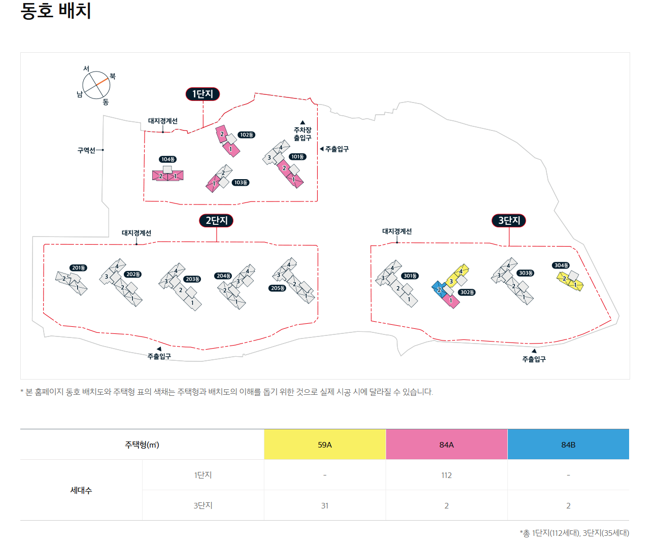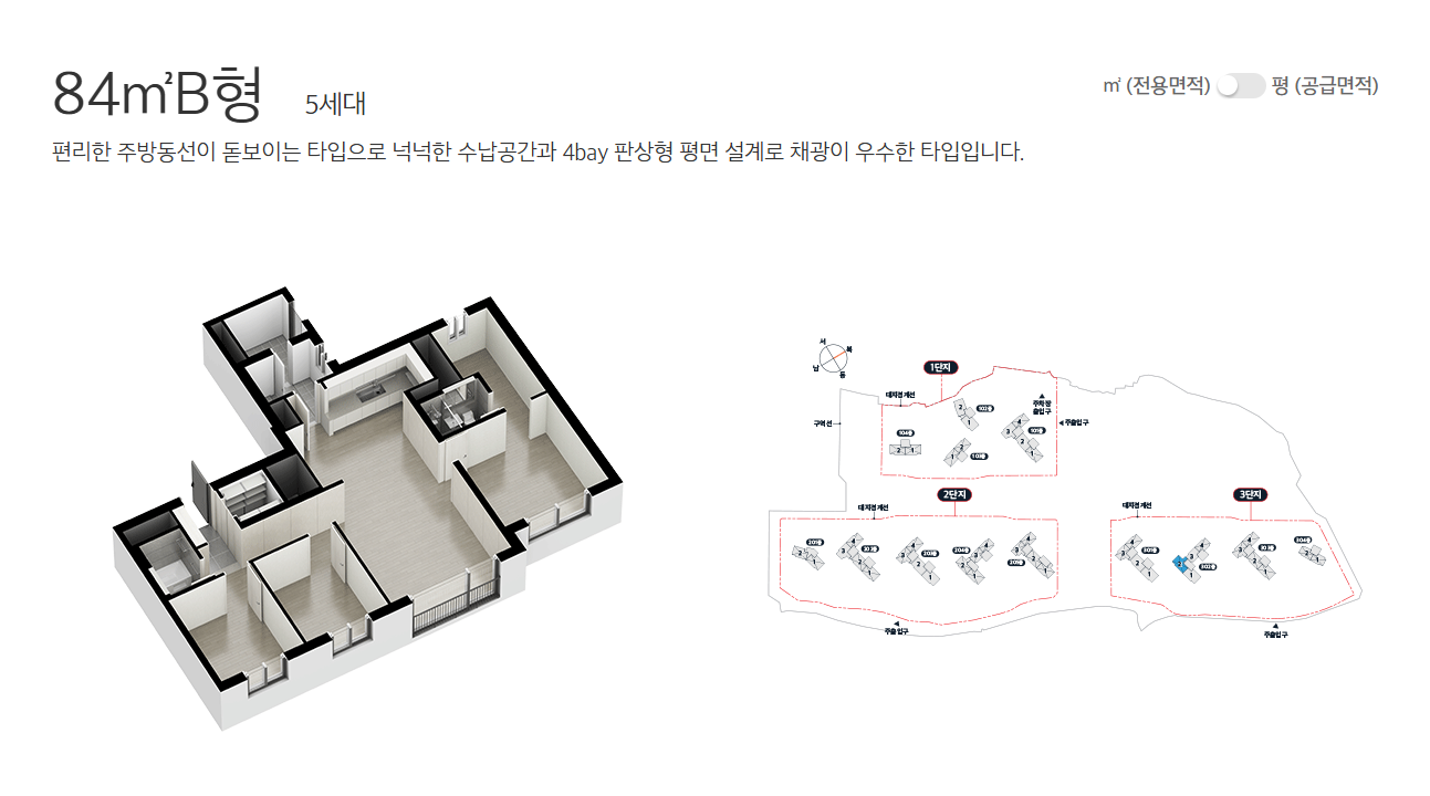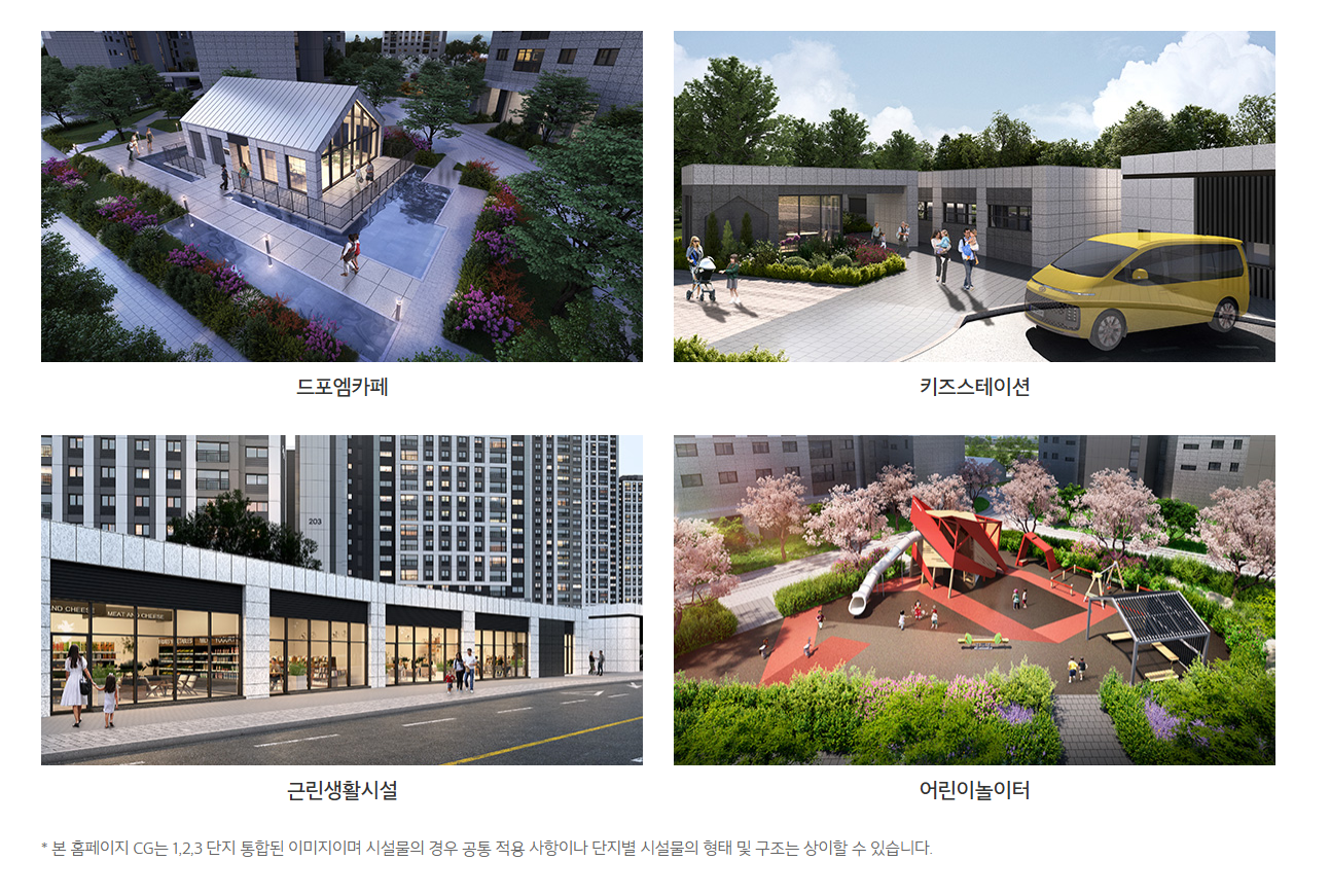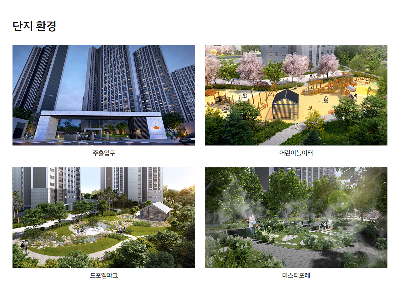 단지는 3개 블록으로 나뉘며 남향 위주의 T자형 동 배치가 특징입니다. 동간 거리를 넉넉히 확보해 사생활 보호에 유리하고, 지상에는 산책로와 썬큰, 어린이놀이터, 키즈 스테이션 등 생활밀착형 공간이 촘촘하게 이어집니다. 차량 동선이 분리되어 아이들과 어르신이 걷기 좋은 환경이 조성된 점은 실거주 만족도를 높이는 요소입니다.
